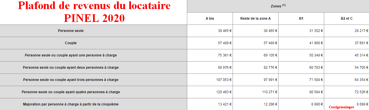 M. Corrigetonimpot loue à Pinel sur une zone B1. Son locataire part en 2021, il doit le remplacer. Il devra demander la notification fiscale 2020 du revenu 2019 du futur locataire. Il sera en mesure de louer la propriété si et seulement si les revenus fiscaux de référence de déclaration de revenus 2020 est inférieure au seuil dans le tableau.
